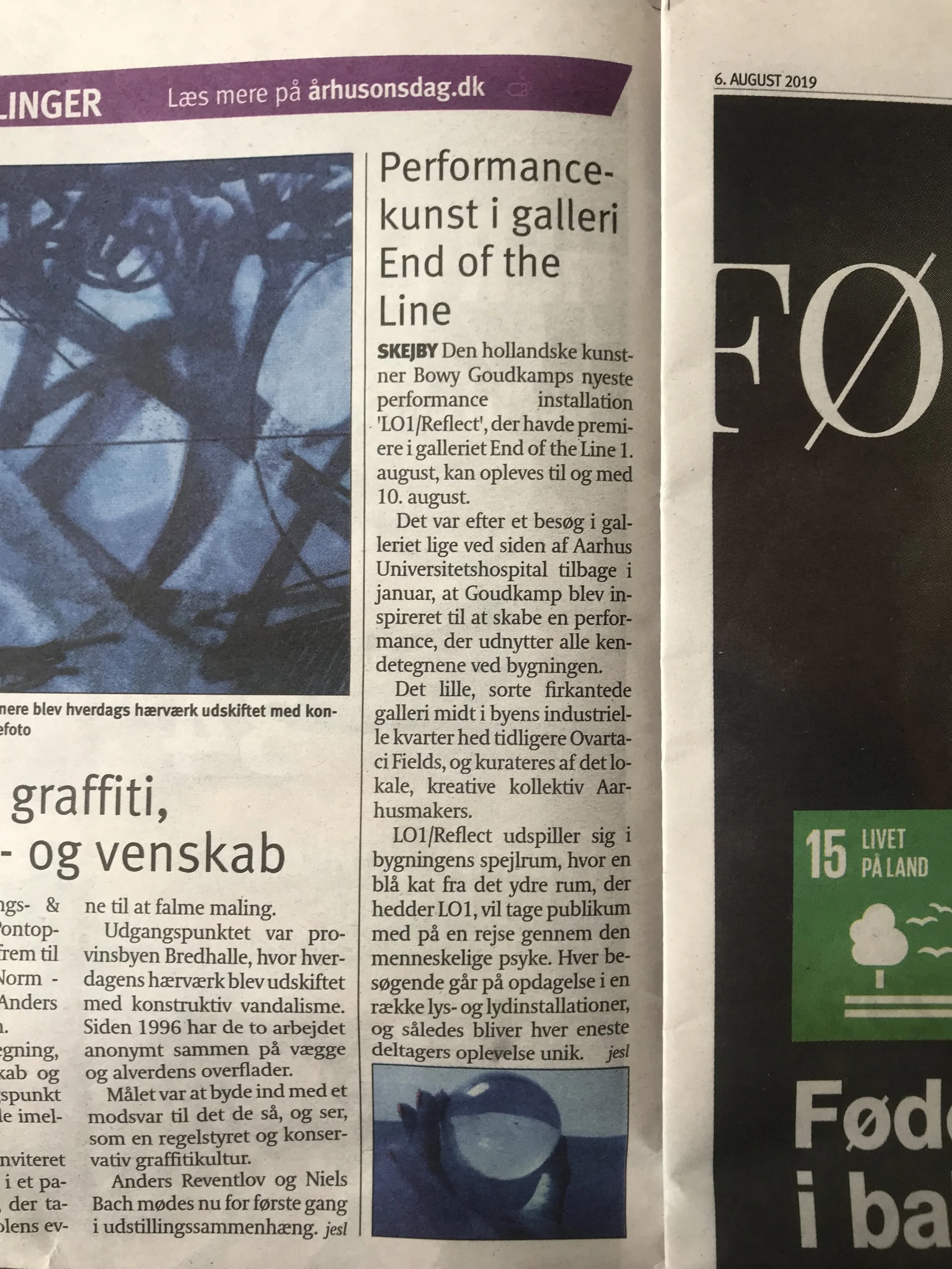 AARHUSMAKERS was delighted to host Bowy Goudkamp’s performance of Lo1/REFLECT at our cultural space, END OF THE LINE, in August 2019. Utilising the space as a catalyst for self-reflection and exploration, Goudkamp and her collaborators created an alternate universe brought to us, the audience, through spoken word, light, sound and space. Opening with a monologue that at once was both mesmerising and arresting, provoking the audience to reassess their human nature, and even their very presence before the blue cat, Lo1. The reflective ‘quiet time’ that followed allowed for a largely personal experience - drawing out hugely diverse reactions from the audience, from insular self exploration to the actions of fellow viewers becoming a performance in itself. Whatever the interpretation, Lo1/REFLECT was a truly unique performance and I look forward to seeing how the artist adapts it to other distinctive spaces.